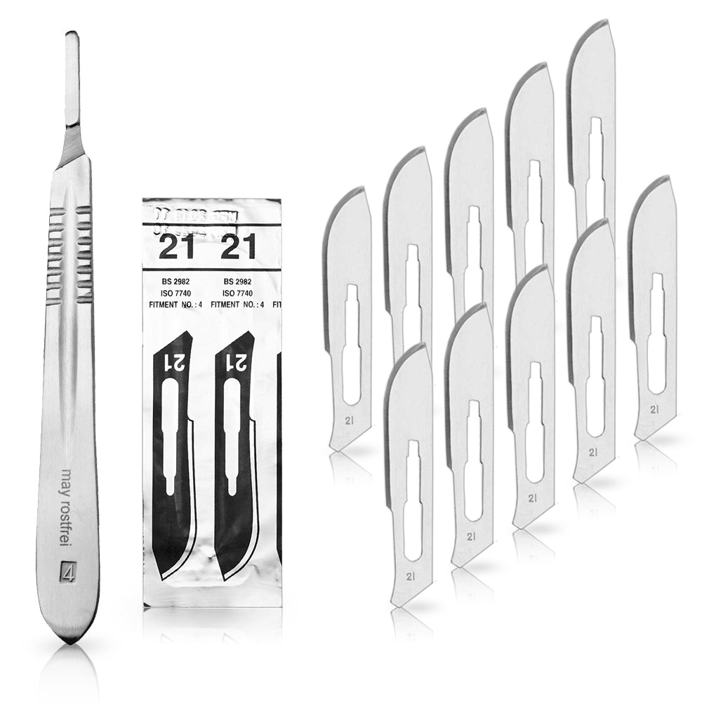 Set - 10 Stück Skalpellklingen Figur 21 aus Karbonstahl - Ersatzklingen einzeln steril verpackt + 1 x May - Skalpellhalter - Edelstahl
