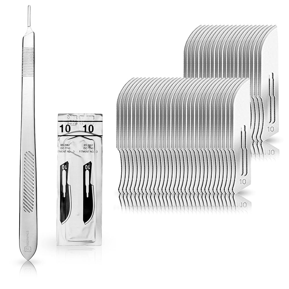 Set - 50 Stück Skalpellklingen Figur 10 aus Karbonstahl - Ersatzklingen einzeln steril verpackt + 1 x May - Skalpell-Halter mit 21 cm langem Griff - Edelstahl