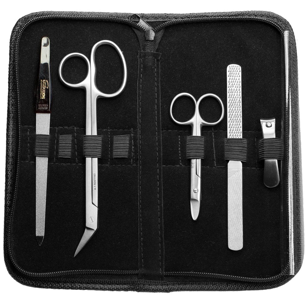 • Umfassendes 6-in-1 Pediküre-Set: Enthält alles für die komplette Fußpflege – extralange Schere, kräftige Nagelschere, Hornhauthobel, Nagelknipser, Solinger Saphirfeile und Etui