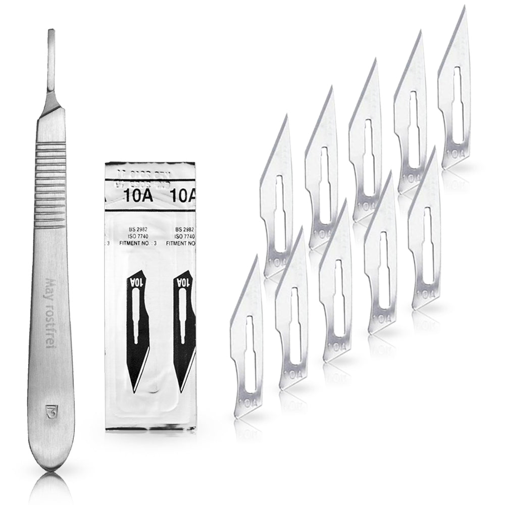 Set - 10 Stück Skalpellklingen Figur 10A aus Karbonstahl - Ersatzklingen einzeln steril verpackt + 1 x Skalpell-Halter - Edelstahl