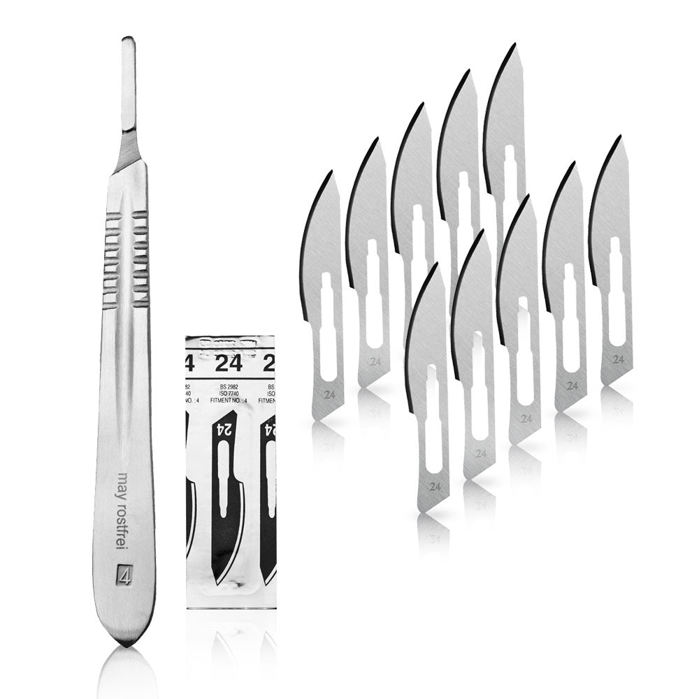 Set - 10 Stück Skalpellklingen Figur 24 aus Karbonstahl - Ersatzklingen einzeln steril verpackt + 1 x Skalpell-Halter - Edelstahl
