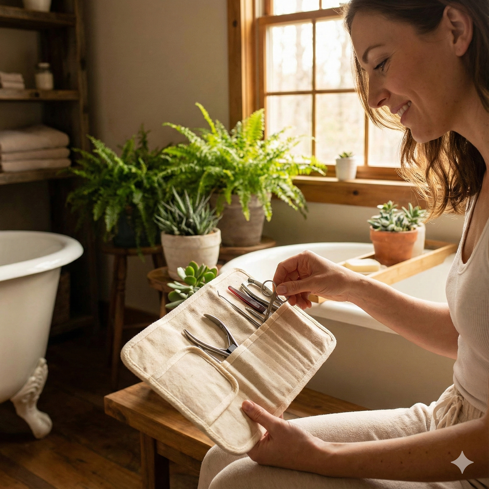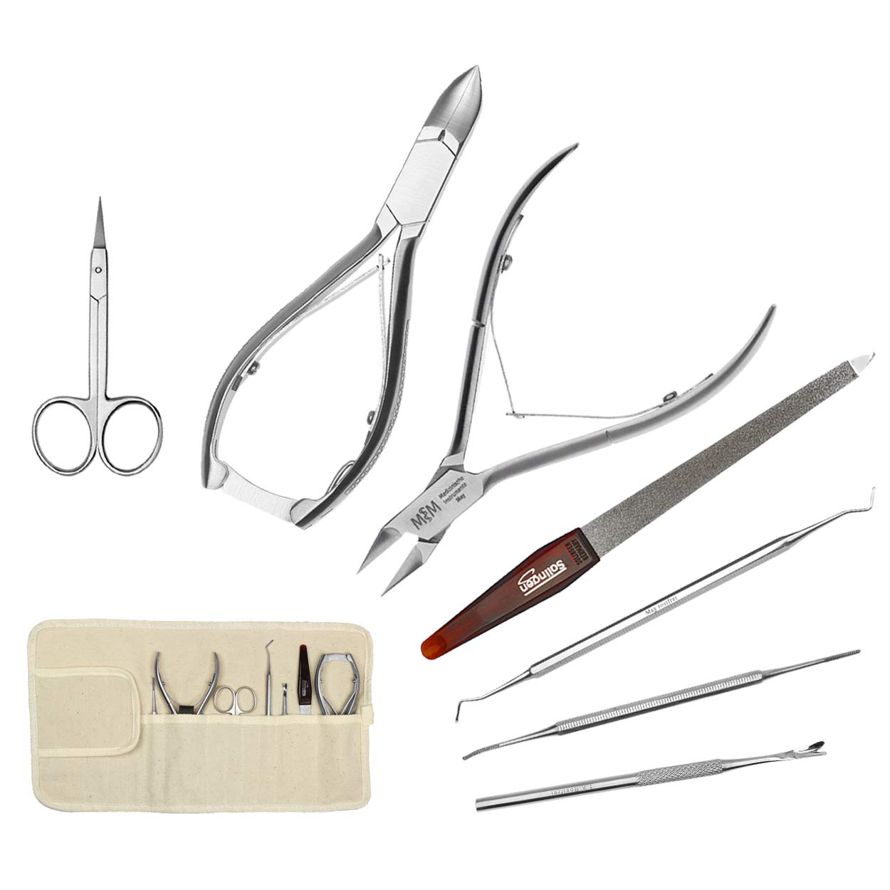 Set Nr. 4 für Maniküre & Pediküre inkl. Nagelzange - 7-teilig mit Leinentasche zum Aufrollen für bis zu 13 Teile