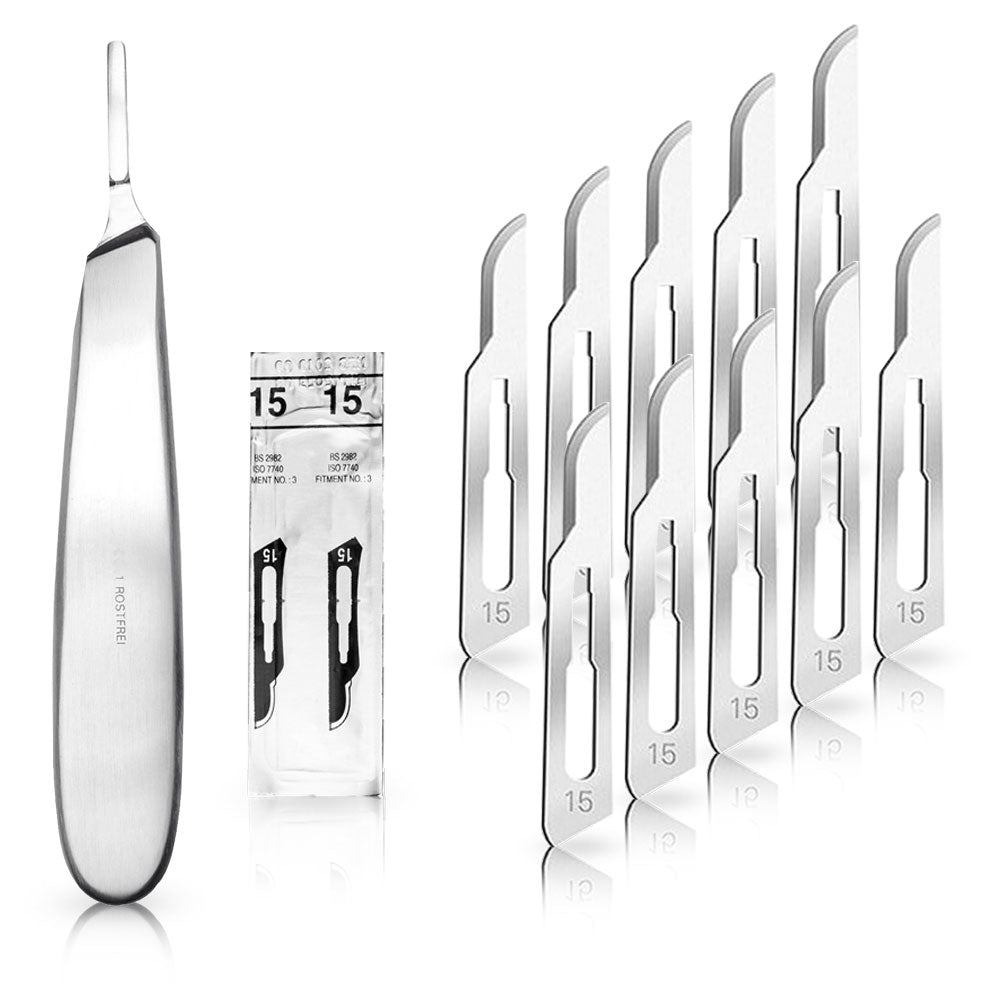 Set - 10 Stück Skalpellklingen Figur 15 aus Karbonstahl - Ersatzklingen einzeln steril verpackt + 1 x May - Skalpell-Halter mit 13,5 cm langem Griff - Edelstahl