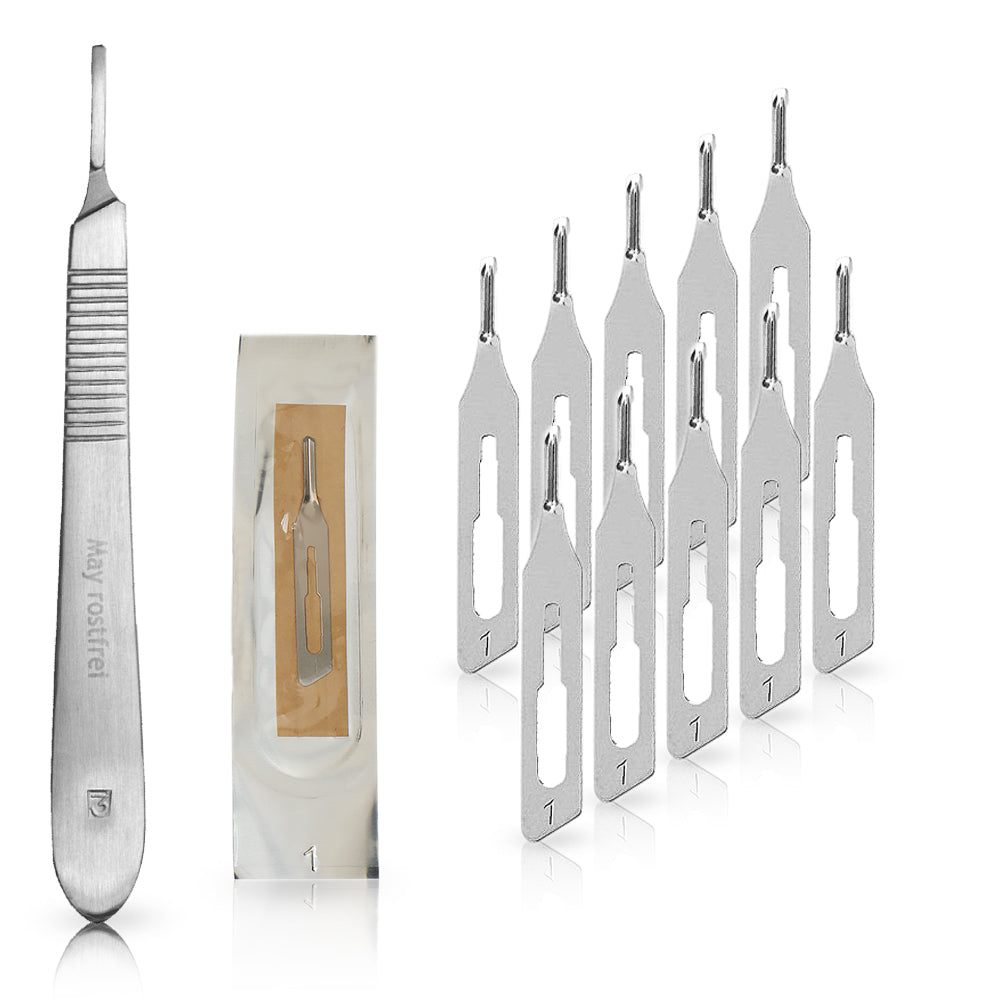 Set 10 x Hohlmei脽elklingen - Figur 1 - einzeln steril verpackt + 1 x May - Skalpell-Halter mit flachem Griff - Edelstahl