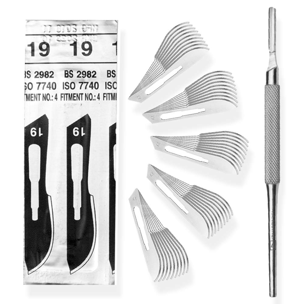 Set - 50 Stück Skalpellklingen Figur 19 aus Karbonstahl - Ersatzklingen einzeln steril verpackt + 1 x May - Skalpell-Halter mit rundem Griff - Edelstahl