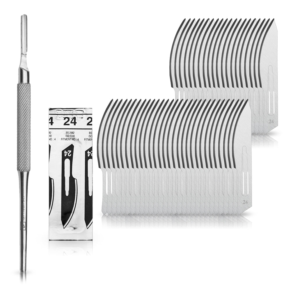 Set - 50 Stück Skalpellklingen Figur 24 aus Karbonstahl - Ersatzklingen einzeln steril verpackt + 1 x May - Skalpell-Halter mit rundem Griff - Edelstahl