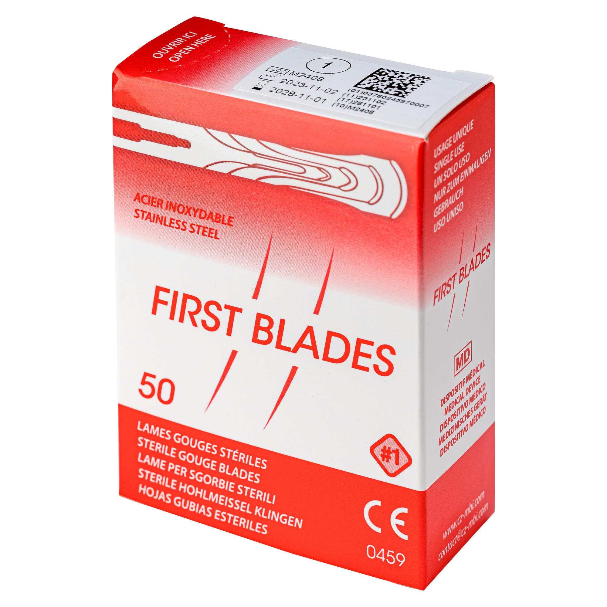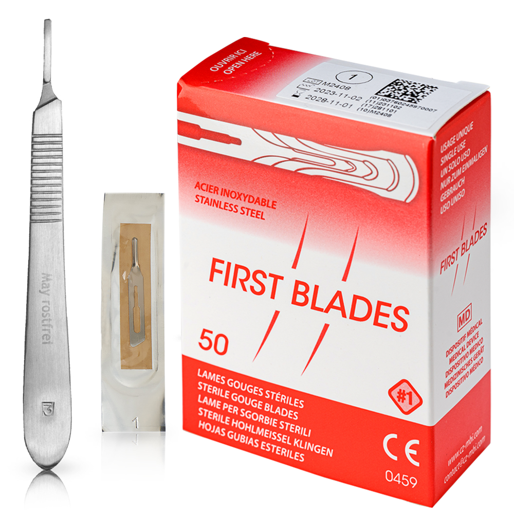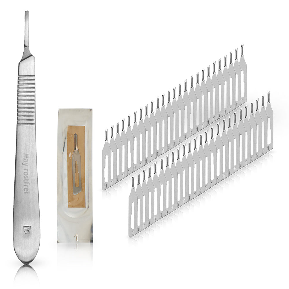 Set 50 St眉ck Hohlmei脽elklingen Figur 1 - einzeln steril verpackt + 1 x Skalpellhalter mit flachem Griff - Edelstahl
